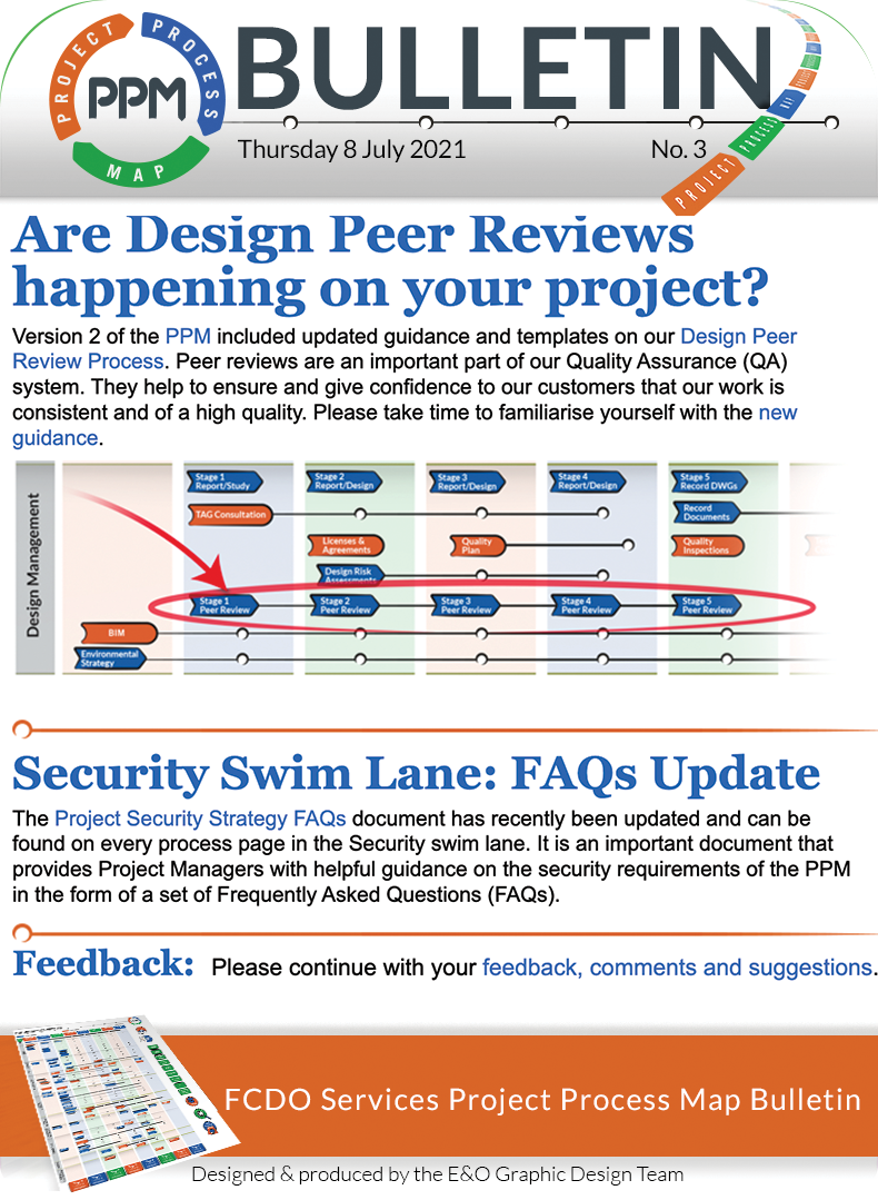 Are Design Peer Reviews happening on your project? Version 2 of the PPM included updated guidance and templates on our Design Peer Review Process. Peer reviews are an important part of our Quality Assurance (QA) system. They help to ensure and give confidence to our customers that our work is consistent and of a high quality. Please take time to familiarise yourself with the new guidance. ![]() ![]() Security Swim Lane: FAQs Update The Project Security Strategy FAQs document has recently been updated and can be found on every process page in the Security swim lane. It is an important document that provides Project Managers with helpful guidance on the security requirements of the PPM in the form of a set of Frequently Asked Questions (FAQs). ![]() Feedback: Please continue with your feedback, comments and sugges |
